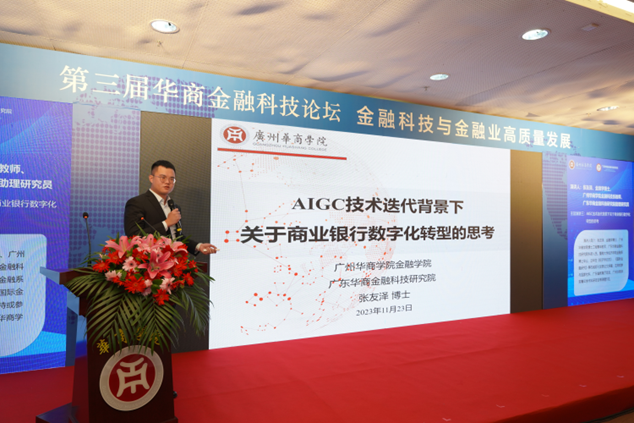 williamhill威廉希尔广东华商金融科技研究院助理研究员张友泽博士作了题为“AIGC技术迭代背景下关于商业银行数字化转型的思考”的演讲。张博士从AIGC技术模型的能力、与商业银行业务结合的潜在赋能点、银行业部署AIGC的策略、银行业应用AIGC模型带来的经济影响和AIGC模型带来的风险与调整五个方面分享了自己最新的思考。