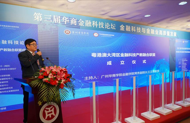 本次论坛的一项重要内容是举行 “粤港澳大湾区金融科技产教融合联盟”成立仪式。主旨演讲结束后,金融学院常务副院长王汉章教授主持了该仪式并宣读联盟发起单位名单,共22家单位。