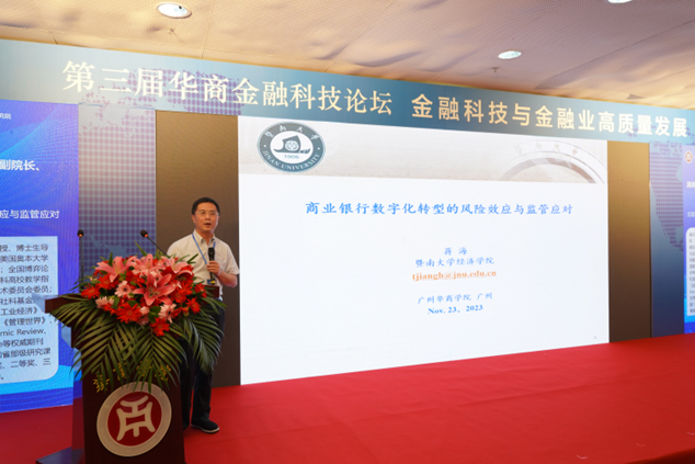 暨南大学经济学院副院长蒋海教授围绕“商业银行数字化转型的风险效应与监管应对”做演讲。蒋教授分别从商业银行数字化转型对风险承担影响和对系统性风险的影响深入浅出地阐述了商业银行数字化转型的风险效应与监管应对。