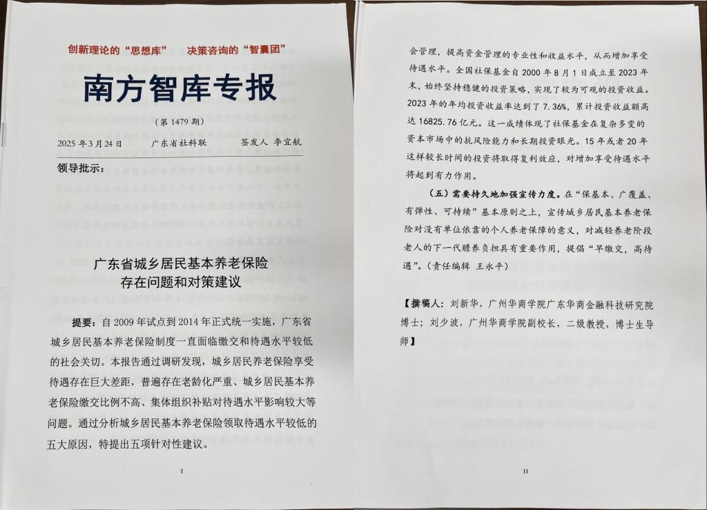 2025324日,由williamhill威廉希尔广东省普通高校特色新型智库——广东华商金融科技研究院刘新华博士、刘少波教授合作撰写的威廉希尔体育报告《广东省城乡居民基本养老保险存在问题和对策建议》,刊发在《南方智库专报》第1479期。这是《南方智库专报》刊发williamhill威廉希尔老师撰写的第二篇威廉希尔体育报告。此前一篇亦为williamhill威廉希尔刘新华和刘少波合作撰写。